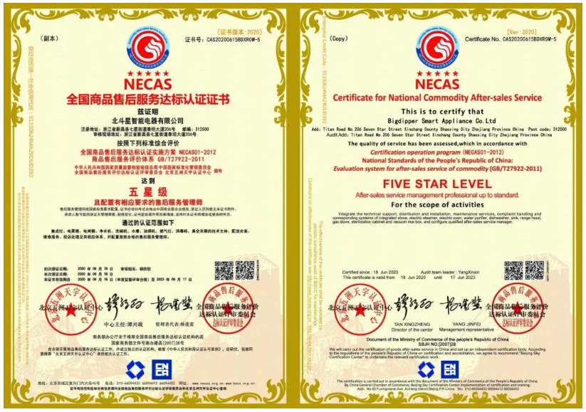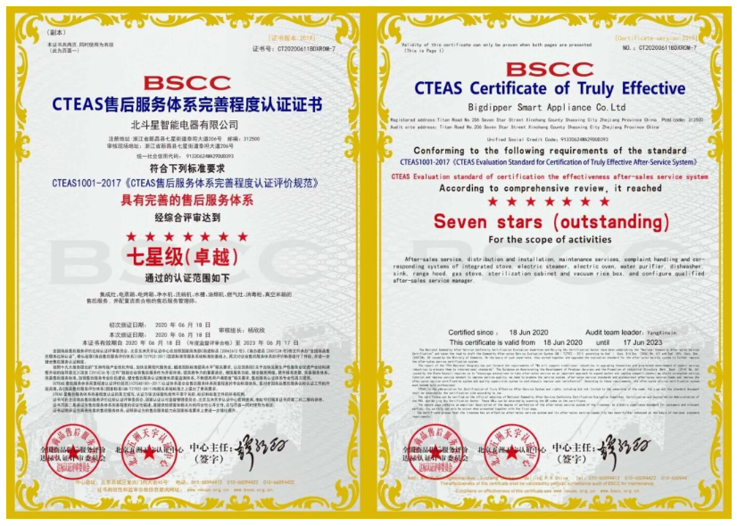 2020年6月,歷經嚴格審核,北斗星集成灶從眾多品牌中脫穎而出,榮獲售后服務認證中的“五星級售后服務認證”和“七星級(卓越)售后服務體系認證”雙認證。這意味著北斗星售后服務質量達到了國家最高標準,樹立行業服務標桿!