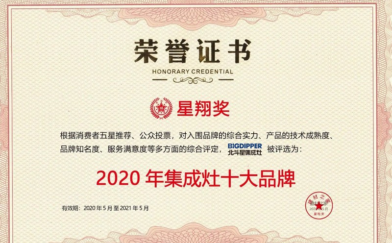據悉,“星翔獎集成灶十大品牌”是由消費者推薦,并經過一個月的公眾投票及專家評審之后得出的獎項,是大眾對北斗星集成灶品質、服務、影響力等多個方面的高度認可。北斗星集成灶以高人氣與高口碑值斬獲“2020年度星翔獎集成灶十大品牌”榮譽稱號!